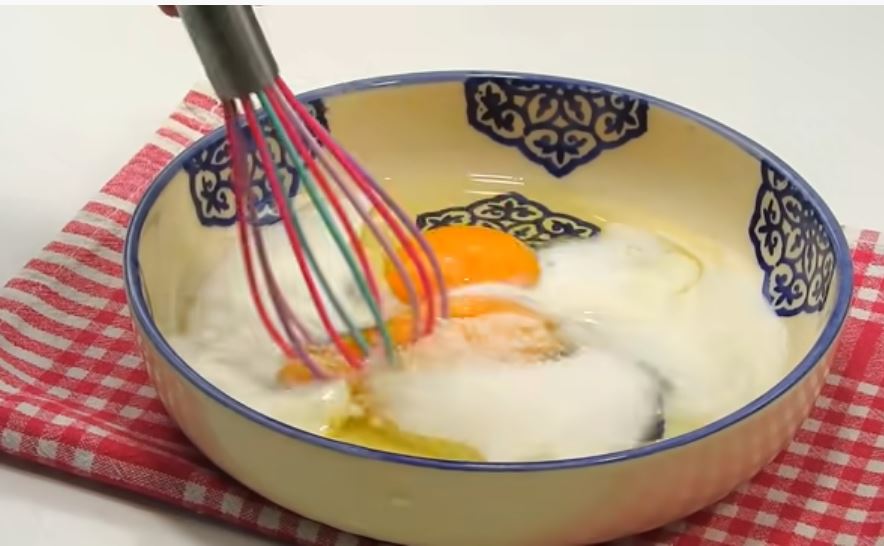 Σε ένα μπολ ρίχνουμε τα αυγά, ζεστό γάλα, ζαχαρη, καια χτυπάμε με ένα σύρμα χειρός.