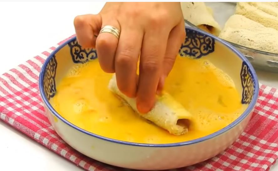 Βουτάμε τα ρολάκια στο αυγό και τα βάζουμε να στραγγιξουν λίγο