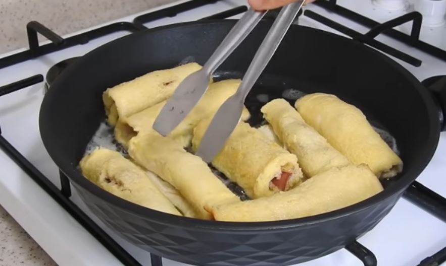 Μόλις κάψει το λάδι βάζουμε τα ρολάκια και τηγανίζουμε μέχρι να ροδίσουν γύρω γύρω.