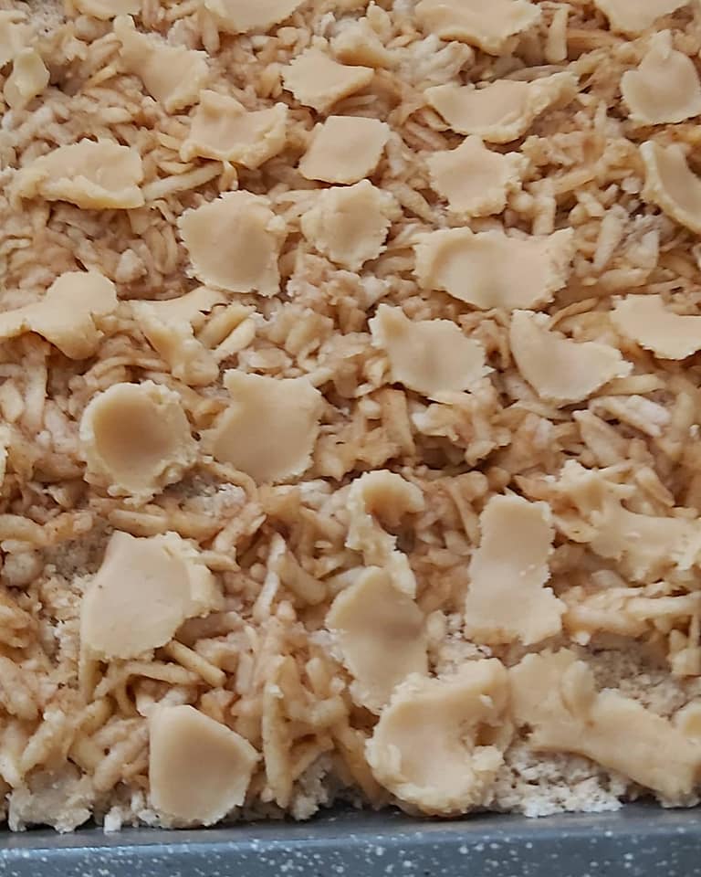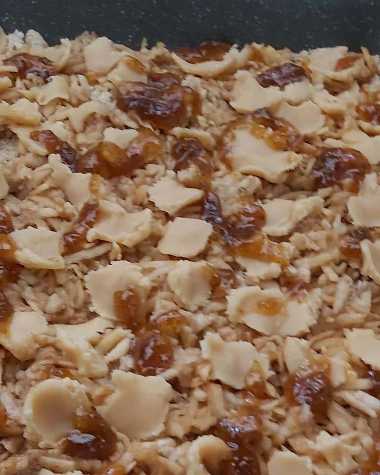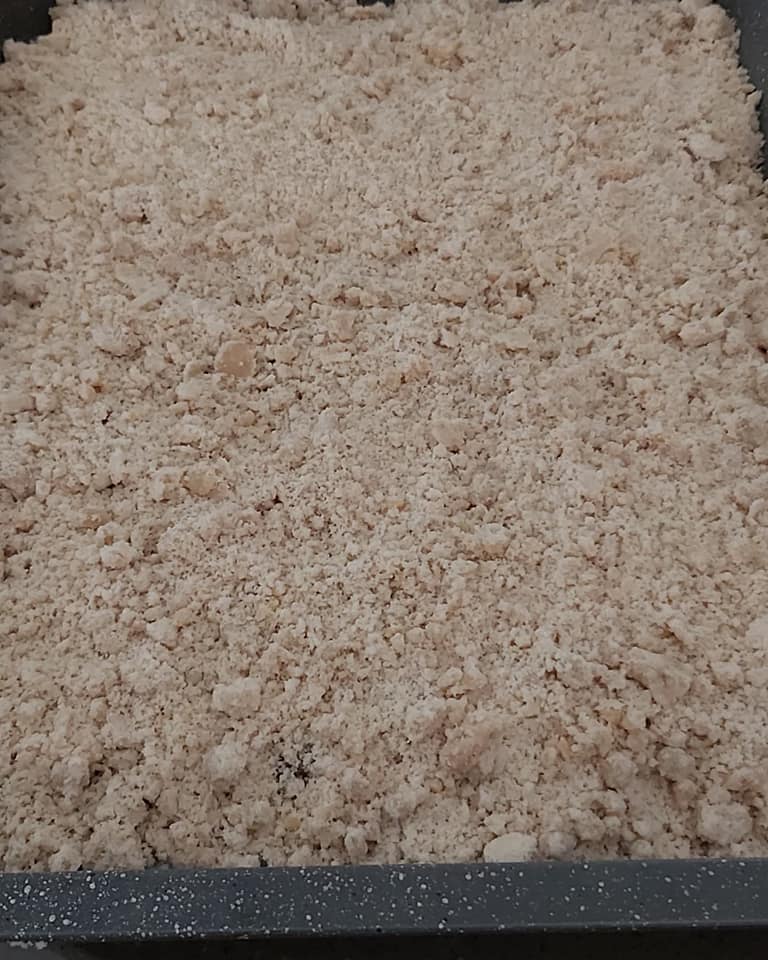 Σε ένα μέτριο ορθογώνιο ταψάκι προσθέτουμε ένα μέρος (το περισσότερο) από το μείγμα να καλύψει το ταψί.