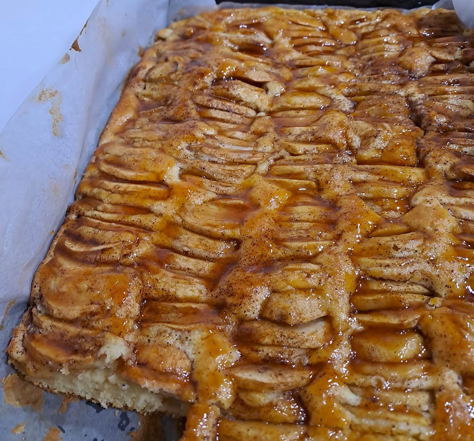 Όταν η μηλόπιτα είναι έτοιμη, την βγάζουμε από το φούρνο και την αφήνουμε να κρυώσει ελαφρώς.