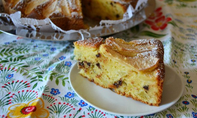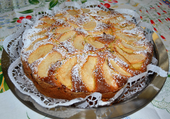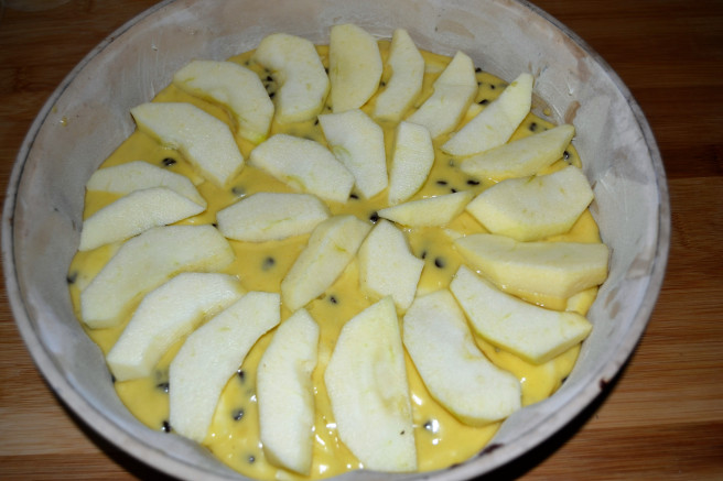 Αφού αναμίξετε καλά τα πάντα, ρίξτε το μείγμα σε μια βουτυρωμένη και αλευρωμένη κατσαρόλα διαμέτρου 26 cm. Κόψτε τα δύο εναπομείναντα μήλα σε σφήνες και τα χρησιμοποιήστε για να διακοσμήσετε το “κορυφαίο” μέρος του κέικ.