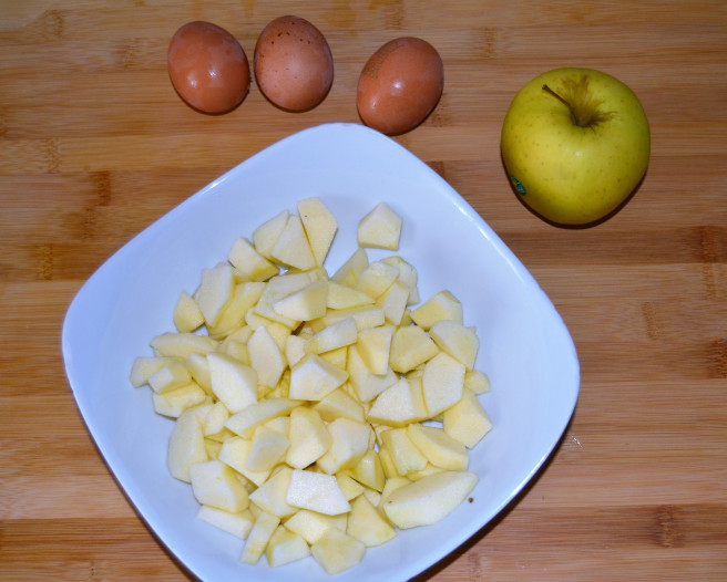 Αρχικά, ξεφλουδίστε τρία μήλα και τα κόψτε σε μικρά κομμάτια. Προσθέστε λίγο χυμό λεμονιού για να μην το σκουρύνει.