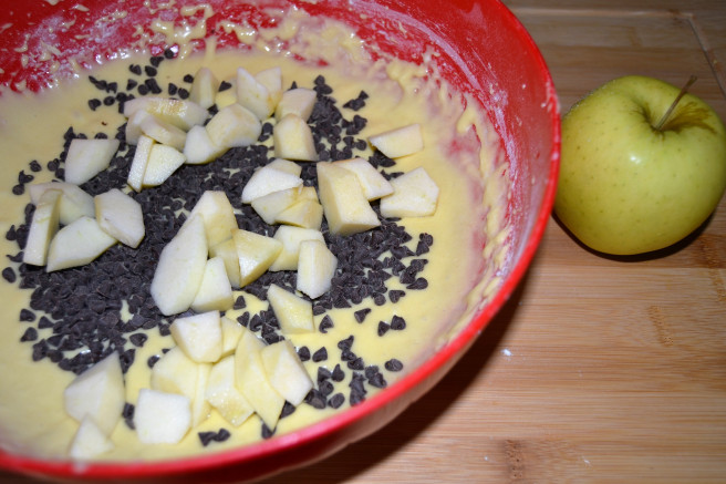 Σε ένα μπολ, χτυπήστε τα αυγά με τη ζάχαρη για περίπου τρία λεπτά, προσθέστε το λιωμένο βούτυρο, το λάδι, το ξύσμα λεμονιού και ανακατέψτε καλά. Προσθέτετε το κοσκινισμένο αλεύρι και το μπεικιν, το αλάτι και τέλος τα μήλα και τα τσιπς σοκολάτας.