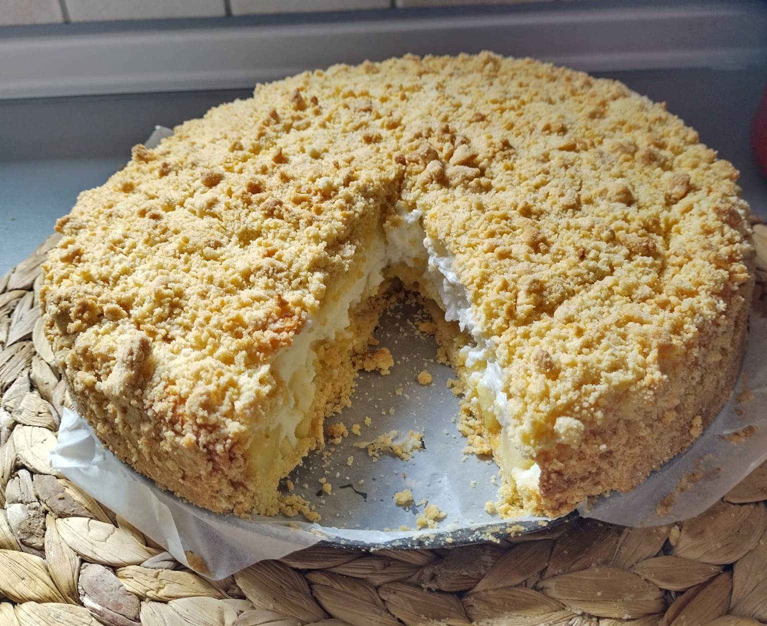 απλώνω την κρέμα σουφλέ και προσεκτικά την υπόλοιπη ψιχουλιαστή ζύμη που είχα κρατήσει.