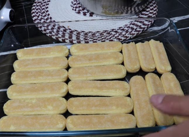 Βυθίζουμε τα σαβαγιαρ στο γάλα και τα βάζουμε στο πυρεξ και στρώνουμε όλη την βάση.
