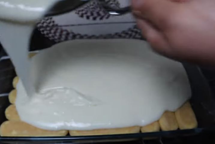 Αδειάζουμε την μισή κρέμα πάνω από τα σαβαγιαρ κα την στρώνουμε