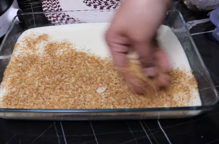 Από πάνω στρώνουμε τριμμένο ψημένο κανταΐφι και καρύδια