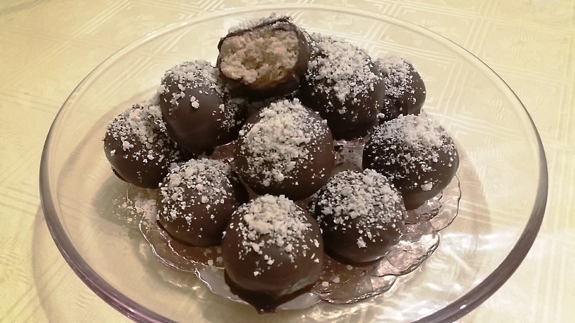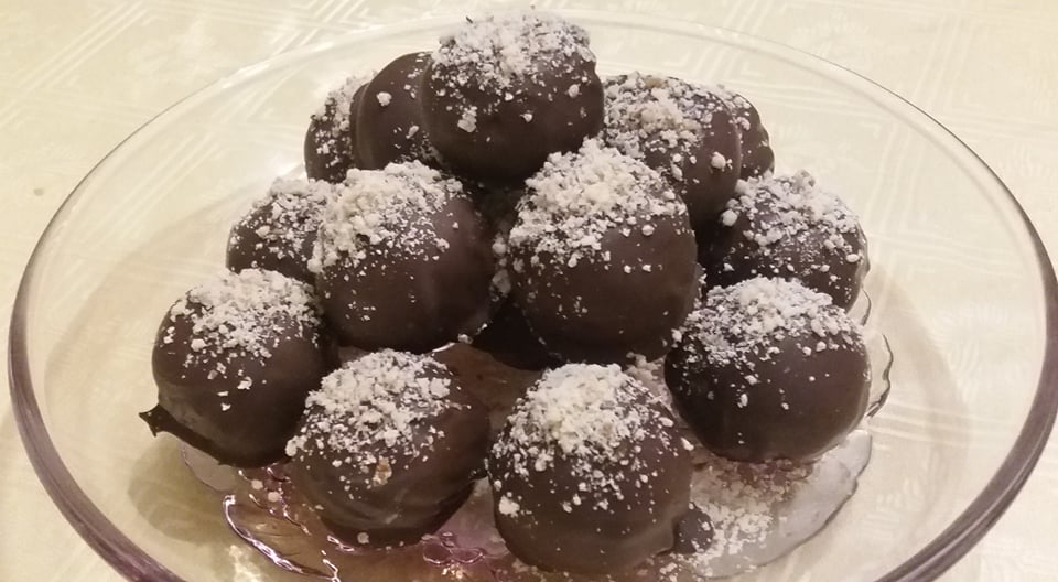 Παίρνουμε ένα ένα μπαλάκι το ρίχνουμε στην λιωμένη κουβερτούρα το καλύπτουμε καλά καλά και στη συνέχεια το τοποθετούμε πίσω στο ταψί.