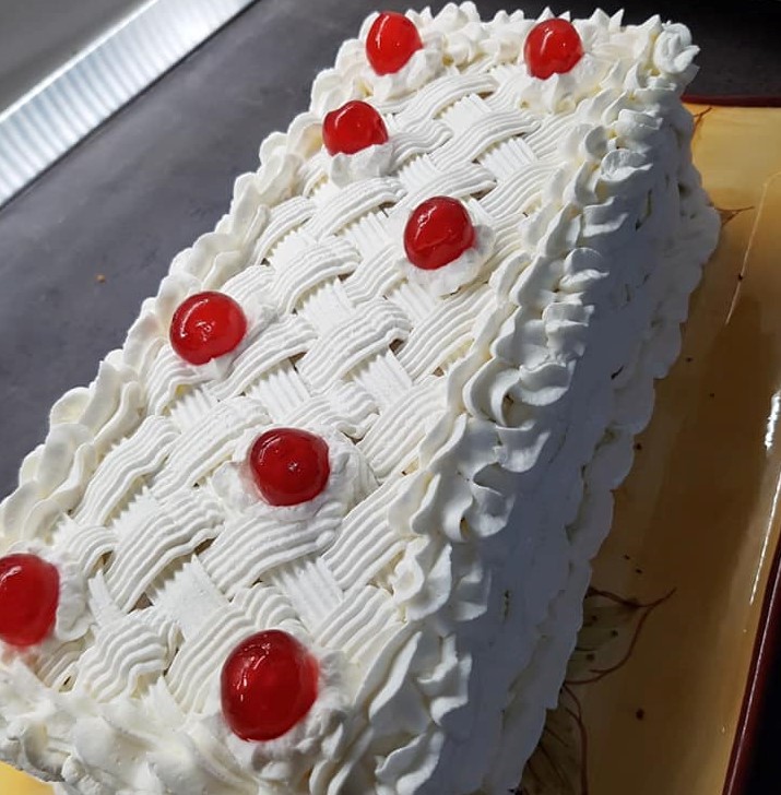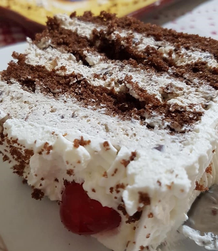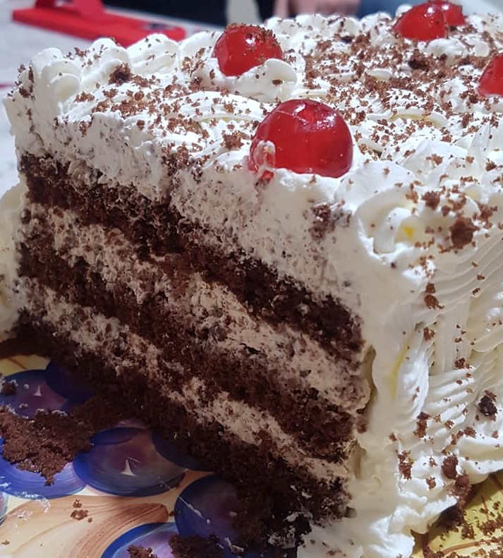 Μεταφέρουμε την πρώτη από τις 3 βάσεις σε ένα ταψί, βρέχουμε τη βάση με το σιρόπι ρούμι, γεμίζουμε με την κρέμα φτιάχνοντας πολλές τούφες μέχρι να καλυφθεί, στρώνουμε τη δεύτερη βάση και επαναλαμβάνουμε όπως πριν, τέλος στρώνουμε την τρίτη βάση, κάνουμε μια στρώση με την κρέμα να την ισοπεδώνουμε καλά Χτυπάμε άλλα 250 ml κρέμα γάλακτος, διακοσμούμε κατά βούληση (έχω κανει εφέ καλαθιού) προσθέτουμε στη γεύση ζαχαρωμένα κεράσια και τα πασπαλίζουμε τα υπολείμματα της βάσης κομμένα καλα προηγουμένως.