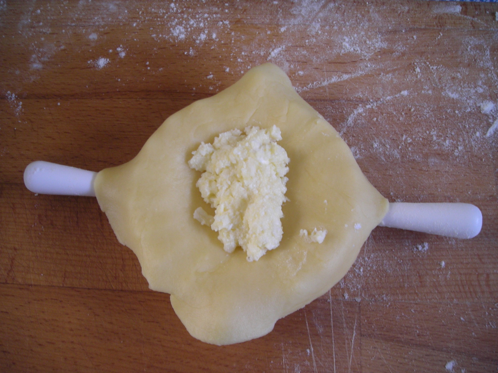 Για τη γέμιση, αναμιγνύουμε τα τυριά με το δυόσμο, και προσθέτουμε αυγό σταδιακά μέχρι το μείγμα να γίνει αφράτο. Στη συνέχεια, παίρνουμε μικρές ποσότητες ζύμης, πλάθοντάς τες αρχικά σε μπαλίτσες στο μέγεθος ενός αυγού. Αλευρώνουμε ελαφρά κάθε μπαλίτσα γύρω-γύρω (η ζύμη είναι τόσο αφράτη που κολλάει εύκολα) και αλευρώνουμε ελάχιστα και τον πάγκο εργασίας. Ανοίγουμε τη ζύμη σε αρκετά λεπτό φύλλο, σχηματίζοντας μια μικρή, μάλλον μακρόστενη πιτούλα.
