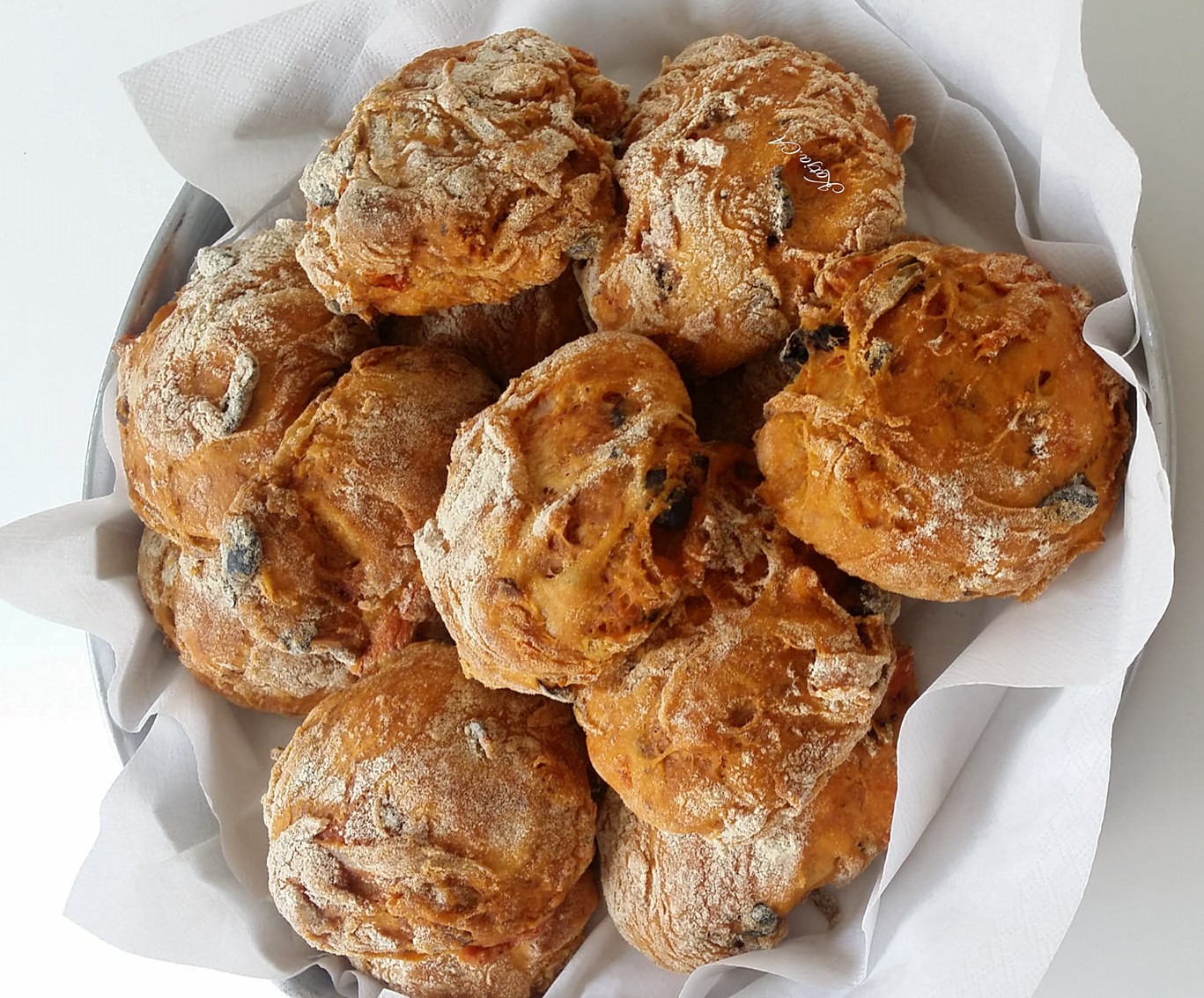 Eίναι μικρά ψωμακια με σούπερ απαλή καρδιά και η ζύμη είναι γεμισμένη με λαχανικά καθώς και με μαύρες ελιές.