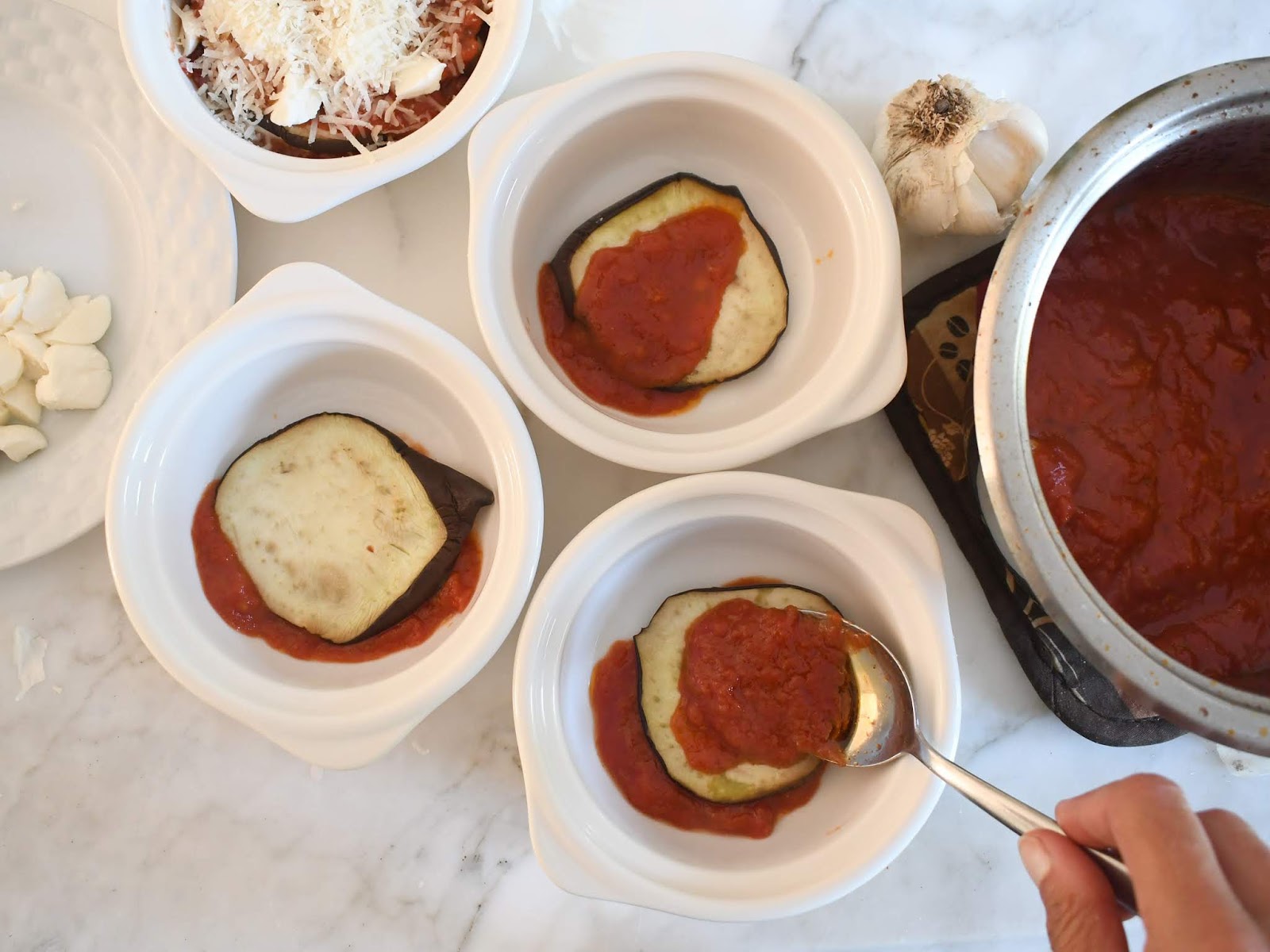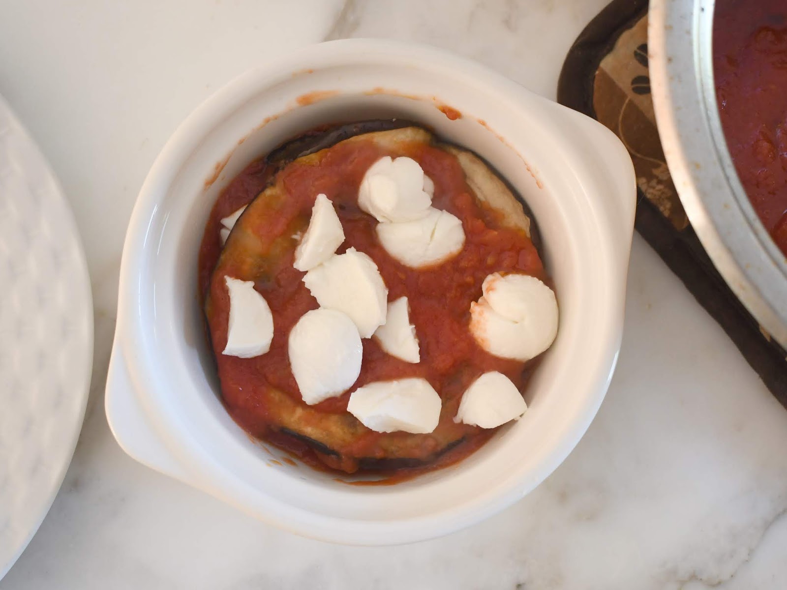 Κάντε ένα στρώμα από μελιτζάνες, ακολουθούμενο από σάλτσα ντομάτας, φρέσκια μοτσαρέλα κομμένο σε μικρούς κύβους.
