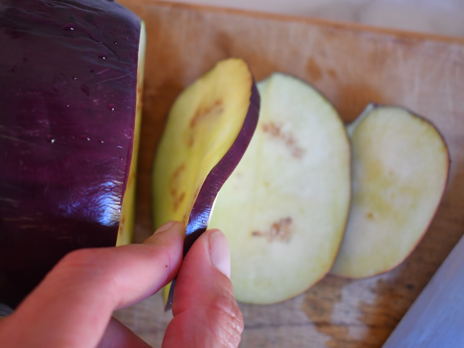 Κόψτε τη μελιτζάνα σε λεπτές φέτες περίπου πάχους 6 mm.