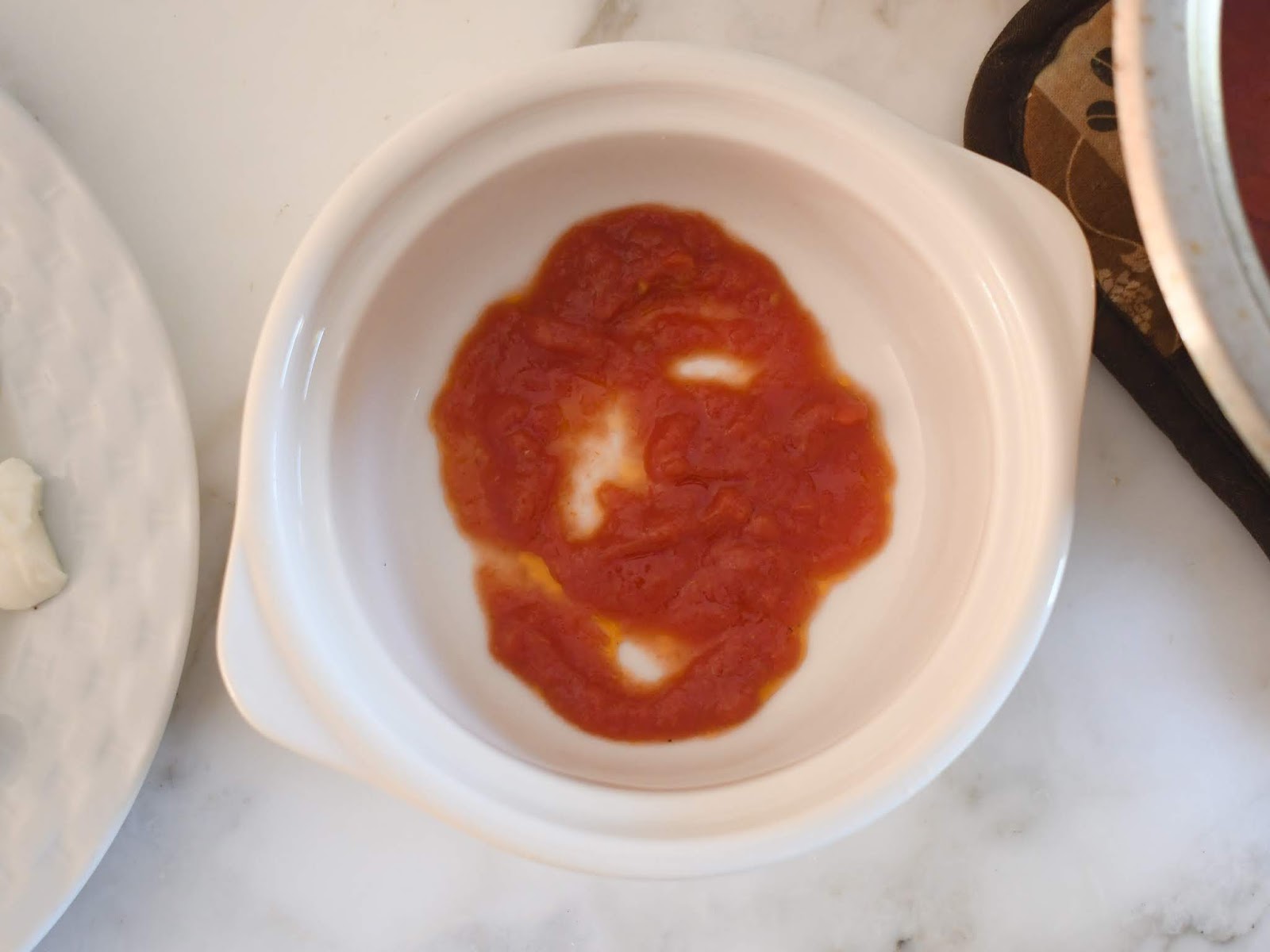 Χρησιμοποιήστε τέσσερα μικρά πήλινα για φούρνο. Προσθέστε μια μικρή σάλτσα ντομάτας στο κατώτατο σημείο του καθενός.