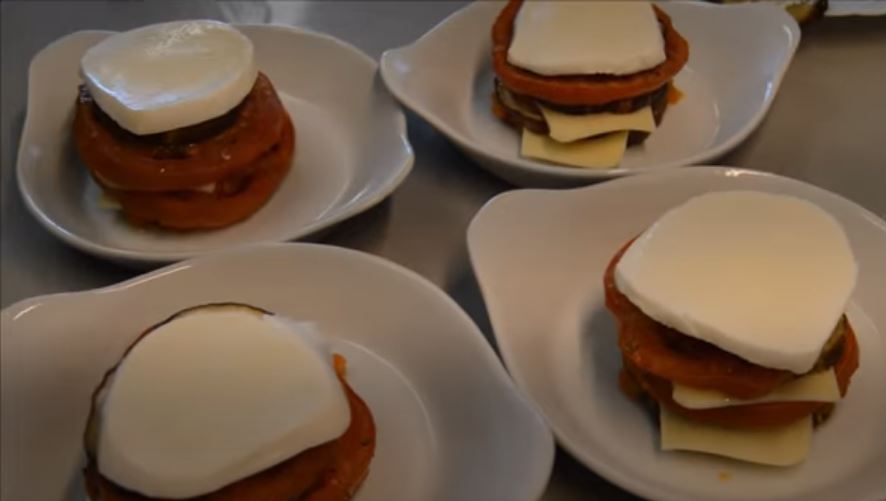 Στήνουμε τα πιατα με μία φέτα μελιτζάνα κάτω – ντομάτα – κασέρι – μελττζάνα – ντομάτα – κασέρι – μελιτζάνα – ντομάτα – μελιτζάνα – φέτες μοτζαρέλα.