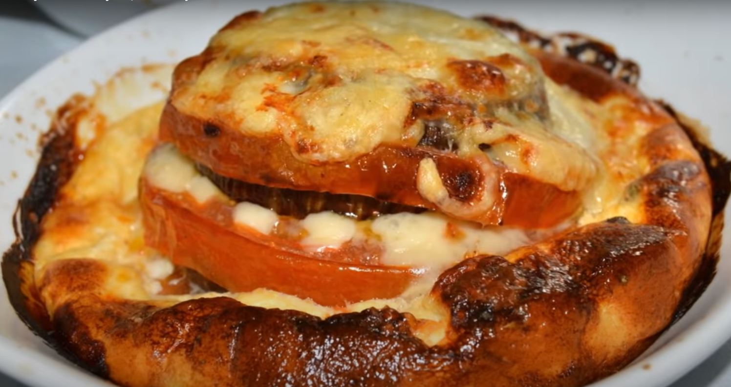 Στήνουμε τα πιατα με μία φέτα μελιτζάνα κάτω – ντομάτα – κασέρι – μελττζάνα – ντομάτα – κασέρι – μελιτζάνα – ντομάτα – μελιτζάνα – φέτες μοτζαρέλα.
