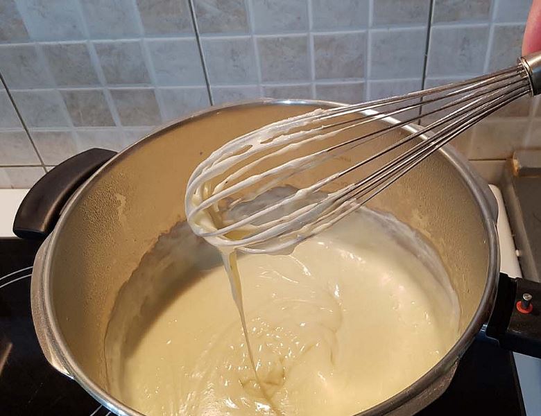 Μόλις αρχίσει να πήζει, μειώνουμε τη θερμοκρασία (π.χ. από 9 σε 7) χωρίς να διακόπτουμε το ανακάτεμα… Ρίχνουμε το αβγό και το Βιτάμ και ανακατεύουμε συνεχώς το μείγμα, μέχρι αυτό να κάνει φουσκάλες και να αρχίσει σιγά-σιγά να στέκεται στο σύρμα. Συνεχές, καλό ανακάτεμα και μείωση της έντασης της κουζίνας… Συνολικά 10 λεπτά κρατάει αυτό το στάδιο της συνταγής.