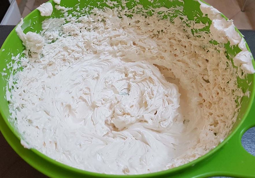Έπειτα, χτυπάμε μία σαντιγί με τρεις κουταλιές της σούπας άχνη ζάχαρη μέχρι να αφρατέψει, και την βάζουμε στο ψυγείο για όση ώρα χρειαστεί μέχρι να κρυώσει η κρέμα.