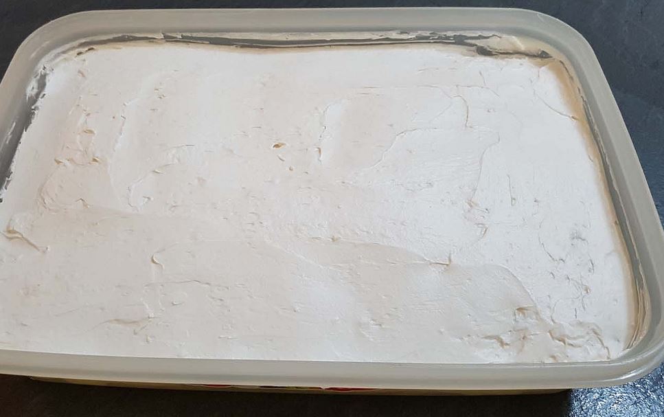 Αρχίζουμε το χτίσιμο… Απλώνουμε μια στρώση σφολιατίνια στον πάτο ενός μεγάλου τάπερ και από πάνω την μισή ποσότητας κρέμας.