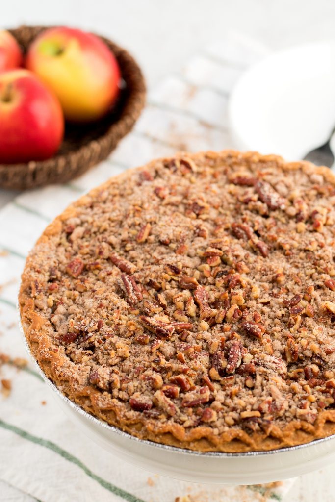 Ανακατέψτε το αλεύρι, τη ζάχαρη και την κανέλα μαζί σε ένα μεσαίο μπολ. Κόψτε  και χτυπήστε το βούτυρο στο μείγμα με ένα μπλέντερ ζύμης μέχρι να έχετε χοντρούς σβόλους. Προσθέστε τα θρυμματισμένα πεκάν και ανακατέψτε για να τα συνδυάσετε καλά.