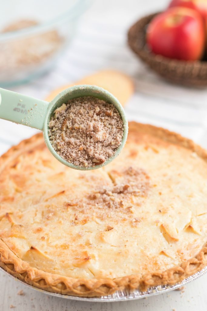 Τοποθετήστε την πίτα πίσω στο φούρνο και ψήνετε για 15 λεπτά ή έως ότου η επικάλυψη πάρει ένα ανοιχτό καφέ χρώμα και τα μήλα είναι μαλακά. Αφαιρέστε από το φούρνο, αφήστε να κρυώσει.