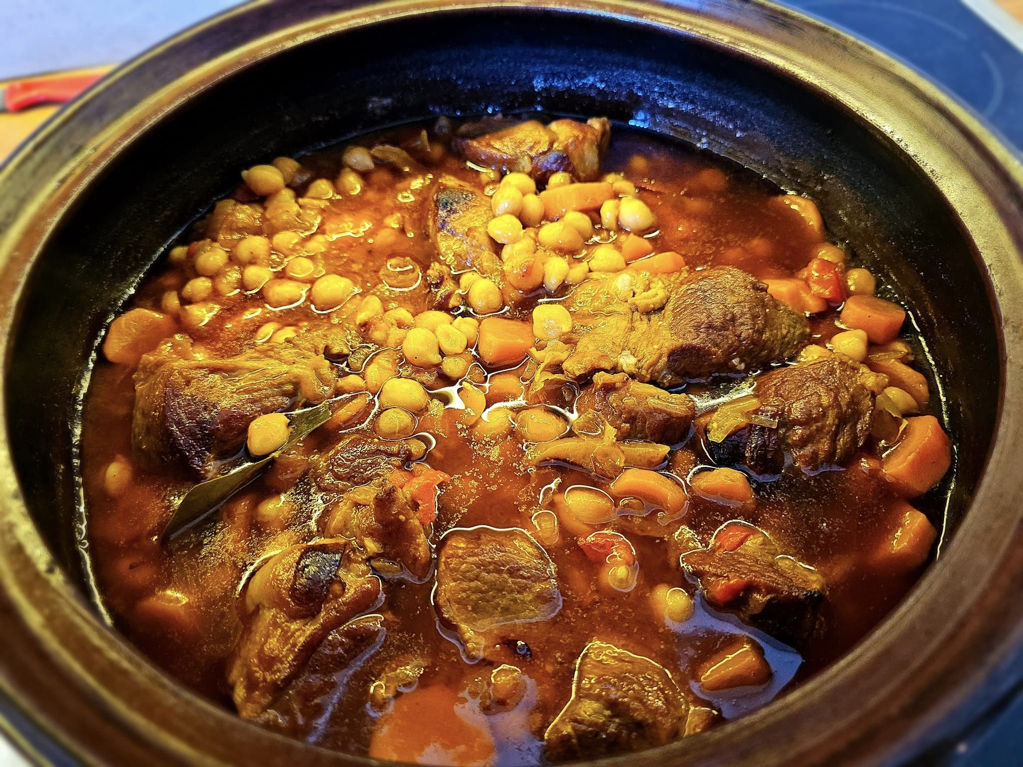Μόλις πάρει μια βράση αποσύρετε την γάστρα από την φωτιά, την σκεπάζετε και την τοποθετείτε σε προθερμασμένο φούρνο στους 200ο C, στις αντιστάσεις πάνω-κάτω, για 2½-3 ώρες.