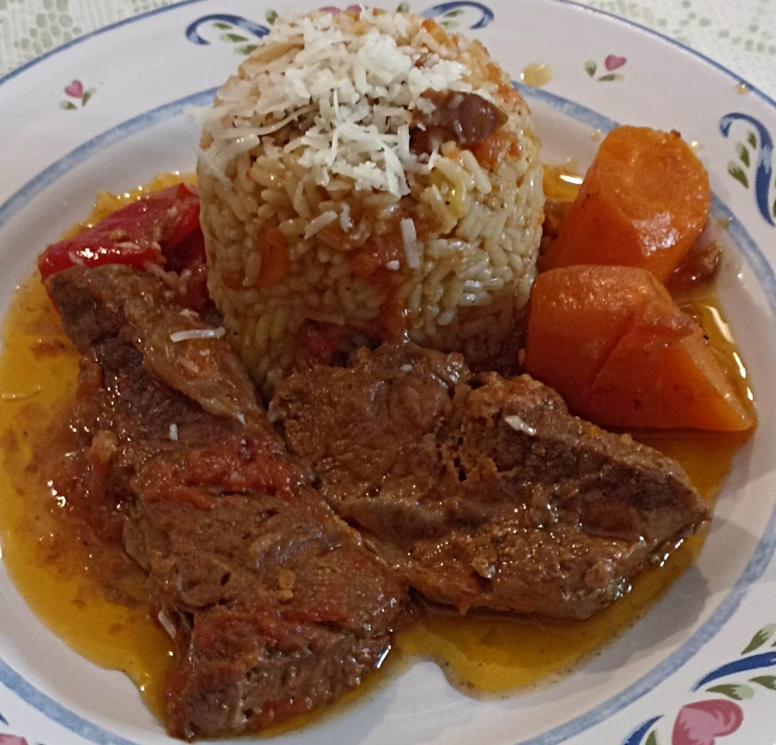 Για το μοσχάρι,έβαλα σε μιά κατσαρόλα το κρεμμύδι ψιλοκομμενο σκόρδο λιωμένο ντομάτα καρότο πιπεριά Φλωρίνης πελτέ αλάτι και πιπέρι μπαχάρι κουρκουμά λάδι και ένα ποτηράκι κρασί λευκό, δεν τα σοταρω τα έβαλα όλα μαζί σε πολύ χαμηλή φωτιά στο 2 και μετά από δυόμισι ώρες είναι έτοιμο!!