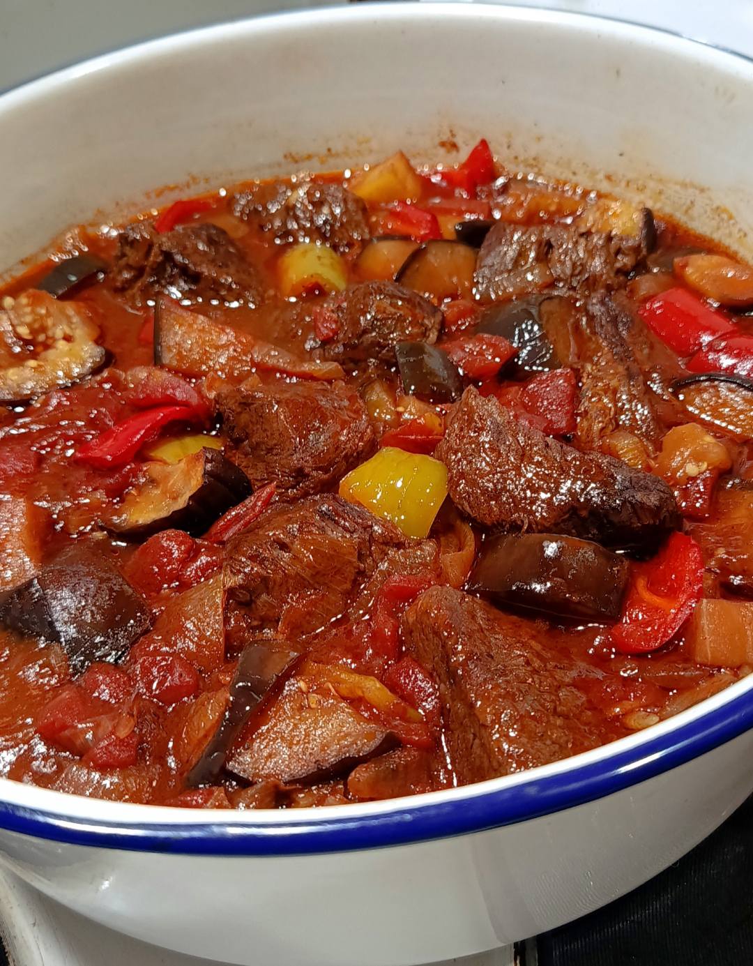 Μοσχάρι Κοκκινιστό με Μελιτζάνες και Πιπεριές