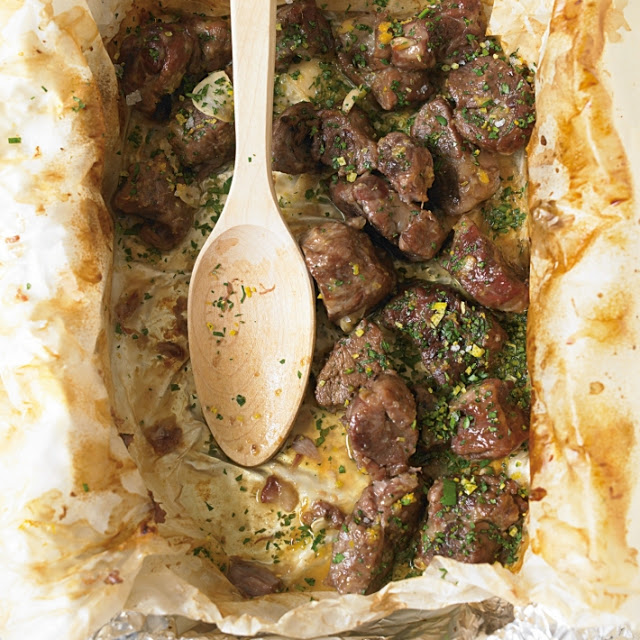 - Προθερμάνετε το φούρνο στο σήμα αερίου 2, 150 ° C.Το μόνο που κάνετε είναι να κόψετε το πλεόνασμα λίπους από το αρνί και να το κόψετε σε κοματάκια 2,5 εκατοστών. Τώρα κοψτε ένα φύλο λαδόκολας αρκετά μεγάλο ώστε να τα τυλίξετε και να τα τοποθετήσετε σε ένα ταψί. Τοποθετήστε τα κομμάτια του κρέατος στο κέντρο του φύλλου. Στη συνέχεια, κοψτε 3 σκελίδες σκόρδο χρησιμοποιώντας την άκρη ενός κοφτερού μαχαίριου, κάντε τομές στο αρνί και εισάγετε τα κομμάτια του σκόρδου μέσα στις σχισμές, κατανέμοντάς τα όσο το δυνατόν ομοιόμορφα.