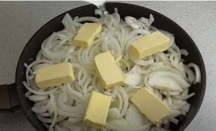 Βάζουμε από πάνω τα κρεμμύδια κομμένα ροδέλες,το βούτυρο ρίχνουμε το νερό και κλείνουμε με το καπάκι. Μαγειρεύουμε σκεπασμένο για 60 λεπτά σε μέτρια φωτιά.’