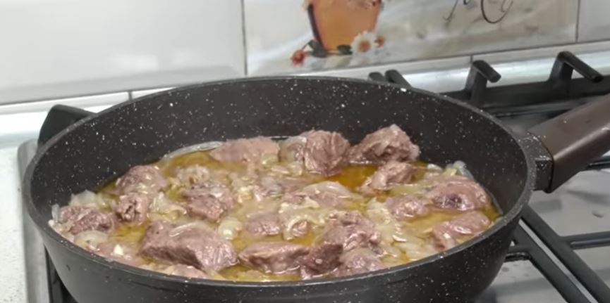 Κόβουμε το κρέας σε μεγάλους κύβους.Το τοποθετούμε σ ένα τηγάνι.