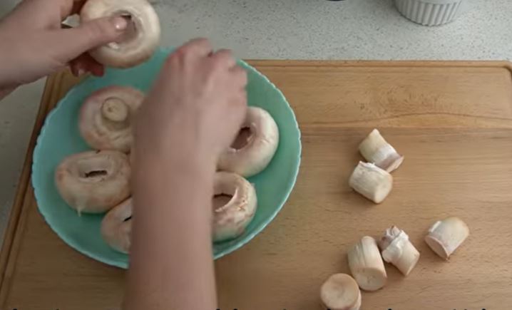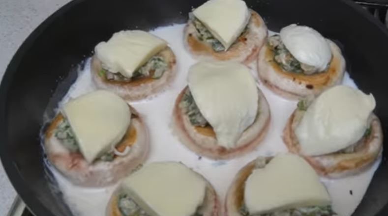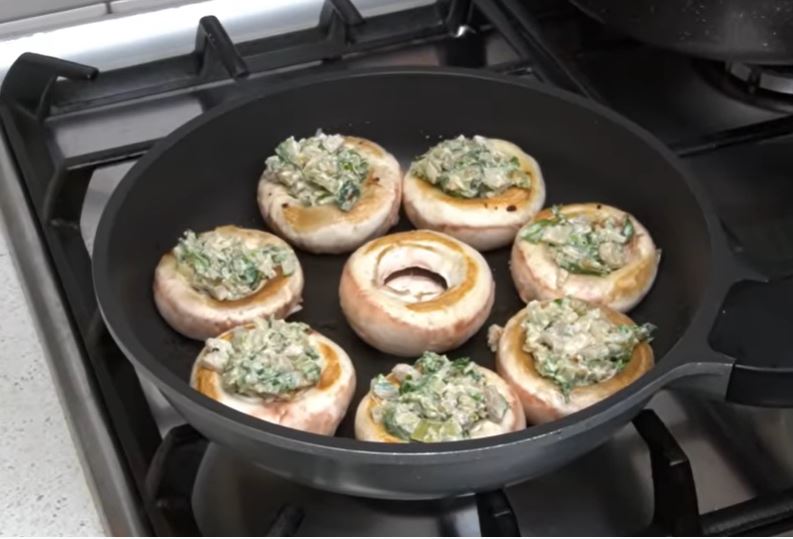 Ζεσταίνουμε ένα τηγάνι με λίγο ελαιόλαδο,βάζουμε τα μανιτάρια και τα τηγανίζουμε από τη μία πλευρά σε δυνατή φωτιά μέχρι να ροδίσουν. Τα γυρίζουμε απ την άλλη πλευρά και τα γεμίζουμε με το μείγμα.