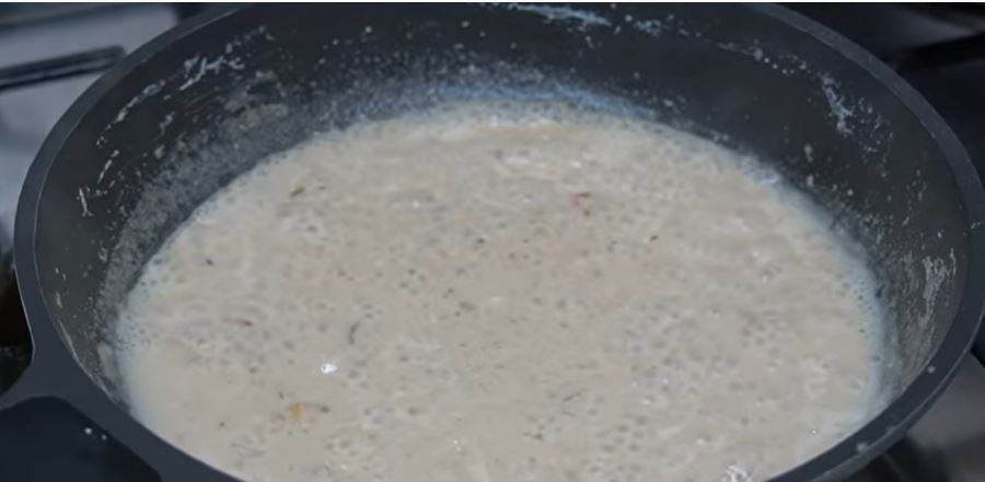 Αλατοπιπερώνουμε ρίχνουμε και το μοσχοκάρυδο και σιγοβράζουμε για 2 με 3 λεπτά μέχρι να πήξει.