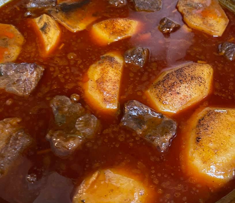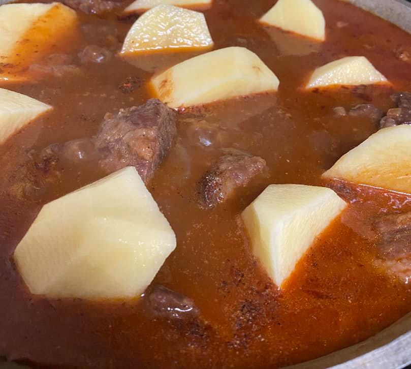 Αφού ψηθεί το κρέας, τοποθετήστε το κρέας και τις πατάτες τακτοποιημένα σε μια κατσαρόλα και καλύψτε με το ζωμό που φτιαξατε.