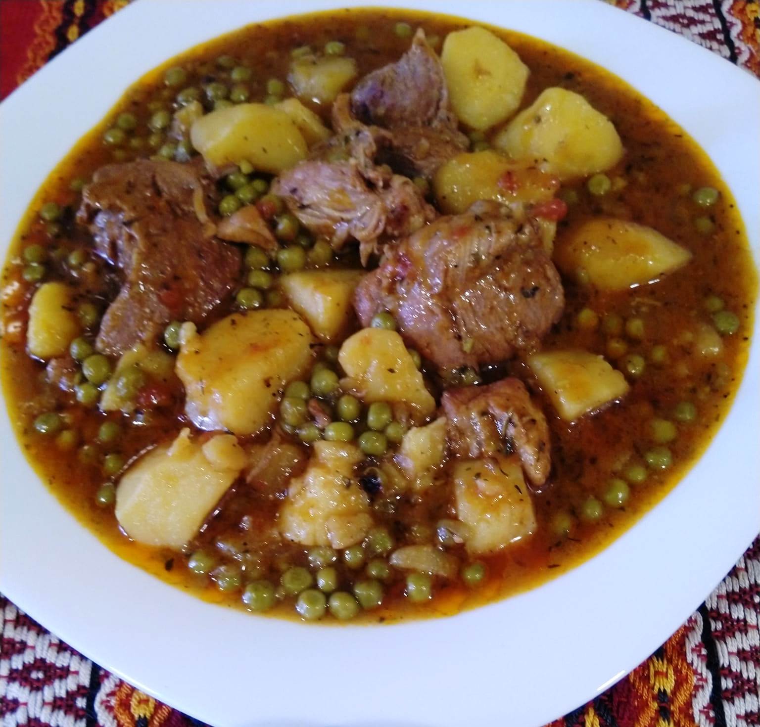 Μοσχαράκι κοκκινιστό με αρακά καροτάκια και πατάτες