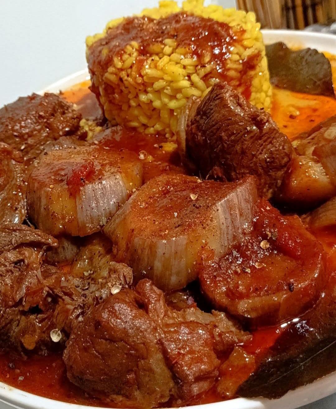 Ανακατεύω να ροδίσει καλά το κρεμμύδι, σβήνω με κόκκινο ξηρό κρασί κι όταν εξατμιστεί το αλκοόλ προσθέτω πελτέ και 1 κονσέρβα ντοματάκια ψιλοκομμένα,Πιπερι, πάπρικα και 2-3 ποτήρια νερό να σκεπαστεί καλά.