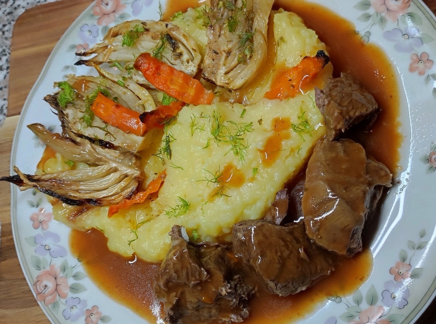 Μοσχαράκι Κοκκινιστό με Πουρέ και Φινόκιο Ψητό