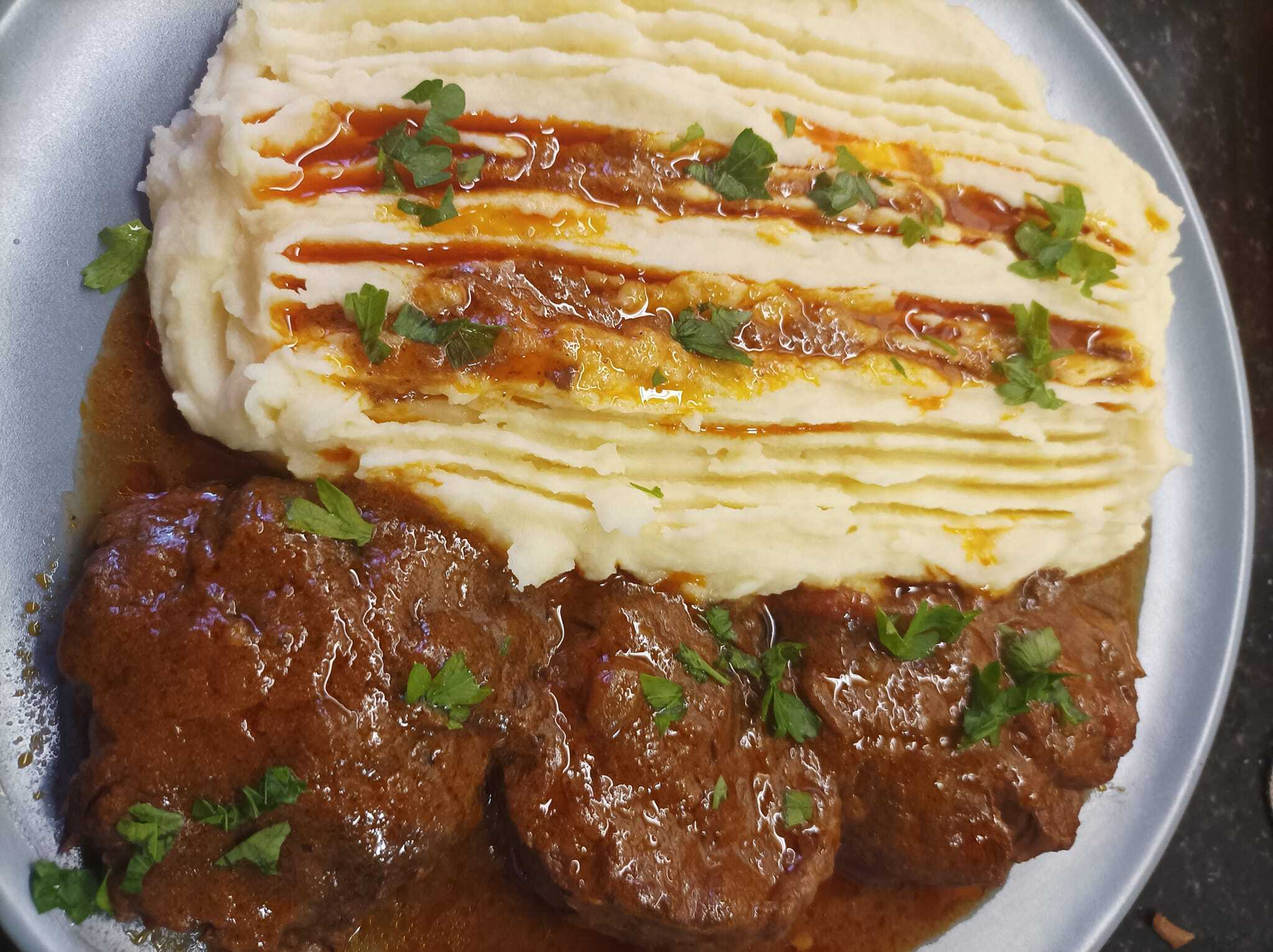 Σερβίρουμε το μοσχαράκι κοκκινιστό με πουρέ πατάτας.