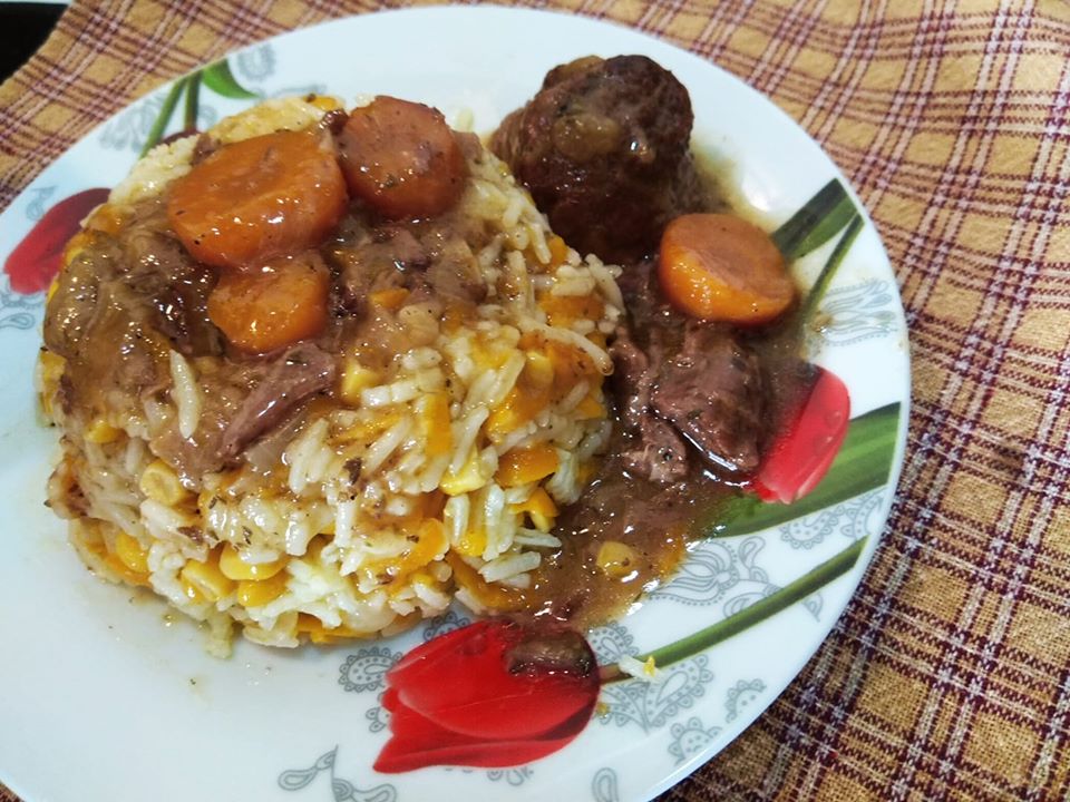 Ρίχνω τη διπλάσια ποσότητα ζεστό νερό από το ρύζι, αλατίζω και αφήνω να βράσει. Αν χρειαστεί, προσθέτω λίγο ακόμα νερό κατά τη διάρκεια του βρασμού. Προς το τέλος, ρίχνω και το καλαμπόκι.