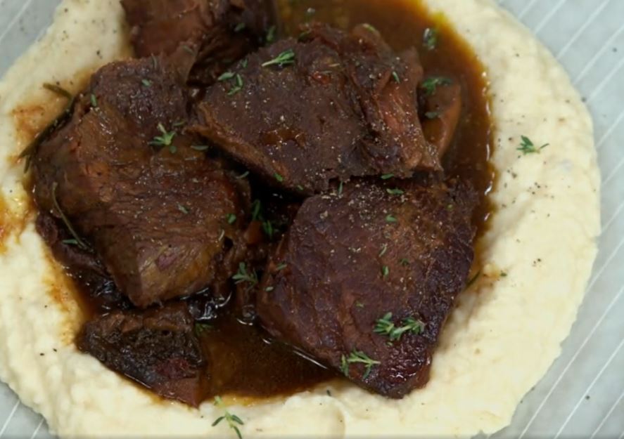 Μοσχαράκι με δαμάσκηνα και πουρέ Σελινόριζας