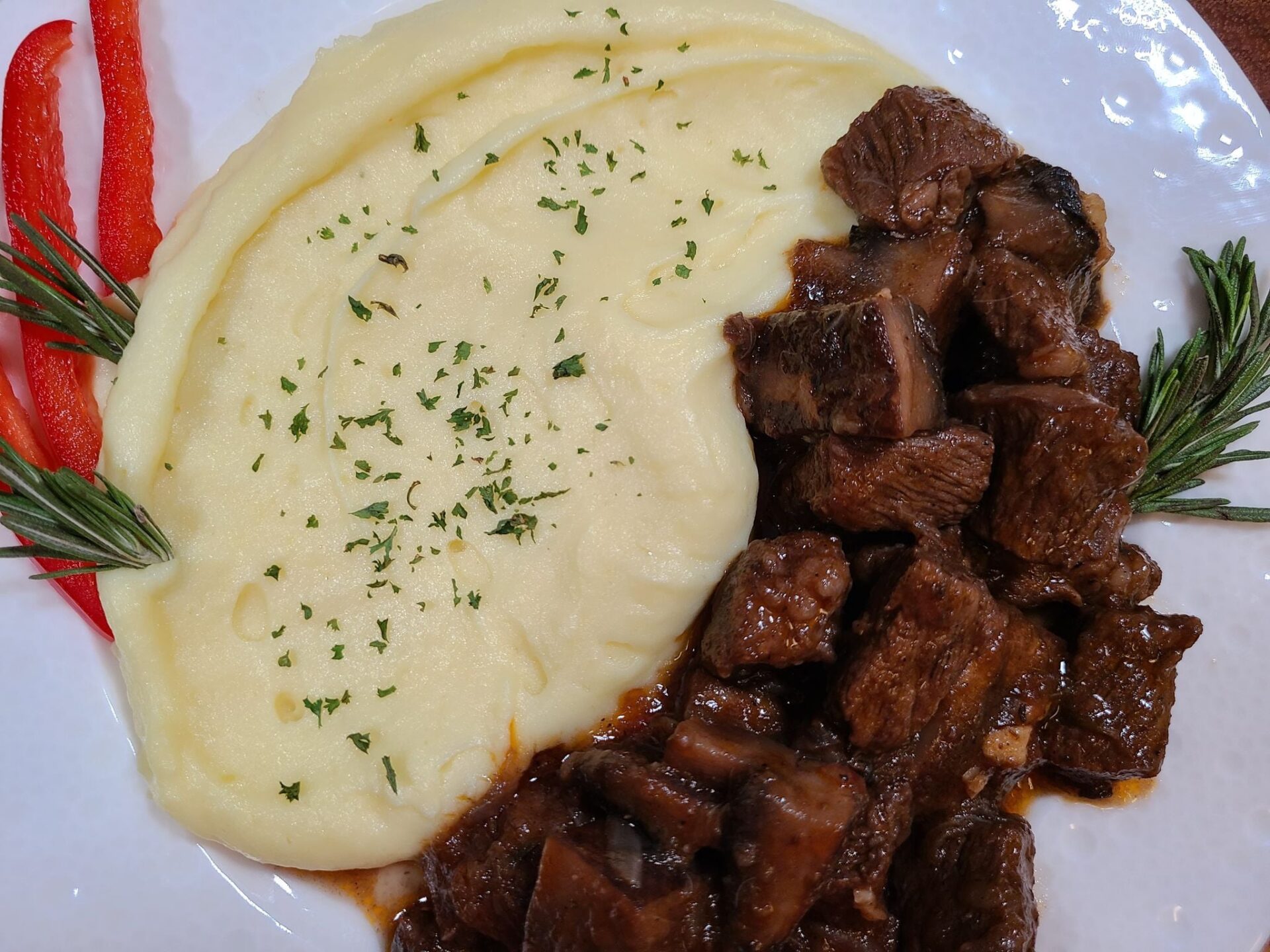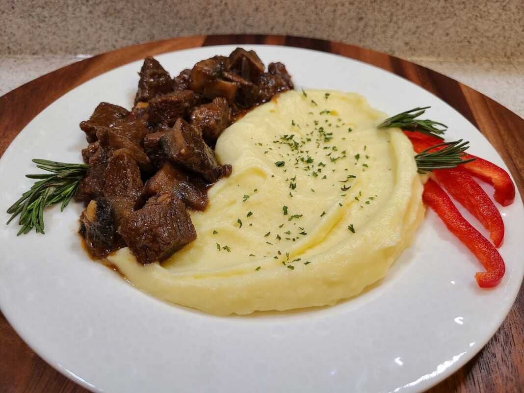 Σέρβιρα το στιφάδο κρέατος με πουρέ αλλά μπορείτε να το σερβίρετε με σοτέ λαχανικά, γαρνιτούρα από ρύζι ή πουρέ λαχανικών.
