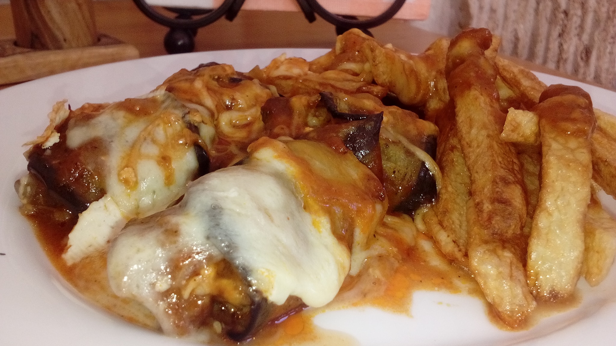 Μοσχαρίσιο κοκκινιστό τυλιγμένο σε λεπτές φέτες μελιτζάνας..