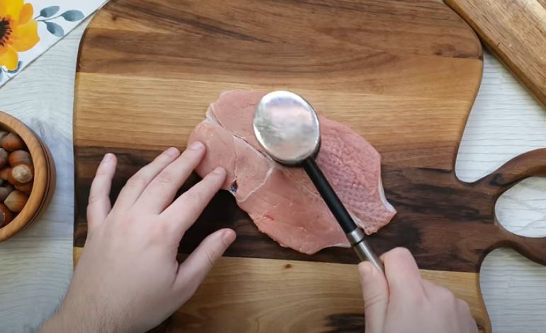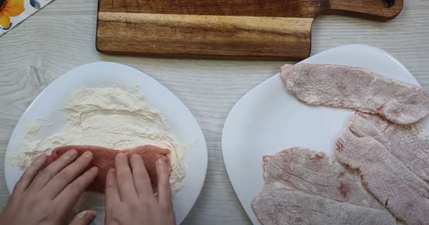 Χτυπήστε τη μοσχαρίσια μπριζόλα με ένα σφυρί και κυλίστε και τις δύο πλευρές σε αλεύρι.