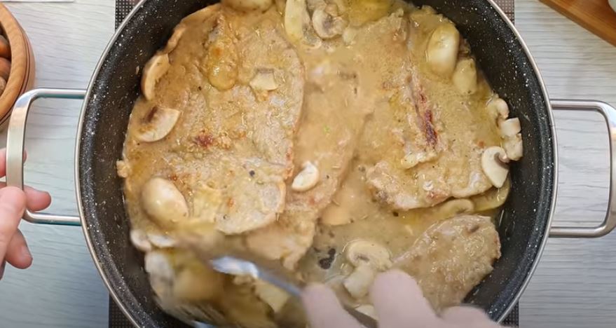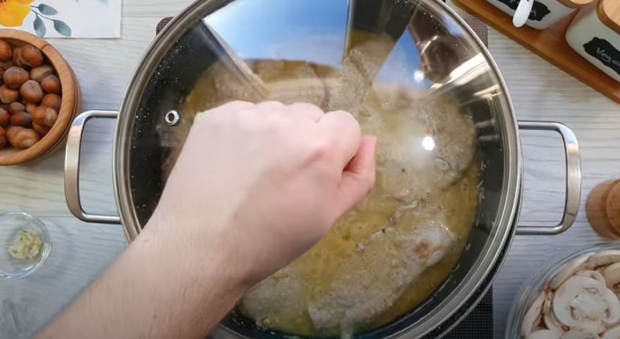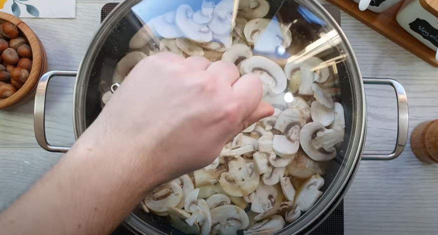 Ενώ οι μπριζόλες σιγοβράζουν, προσθέτουμε τα μανιτάρια στο τηγάνι μαζί με 1 σκελίδα σκόρδο.