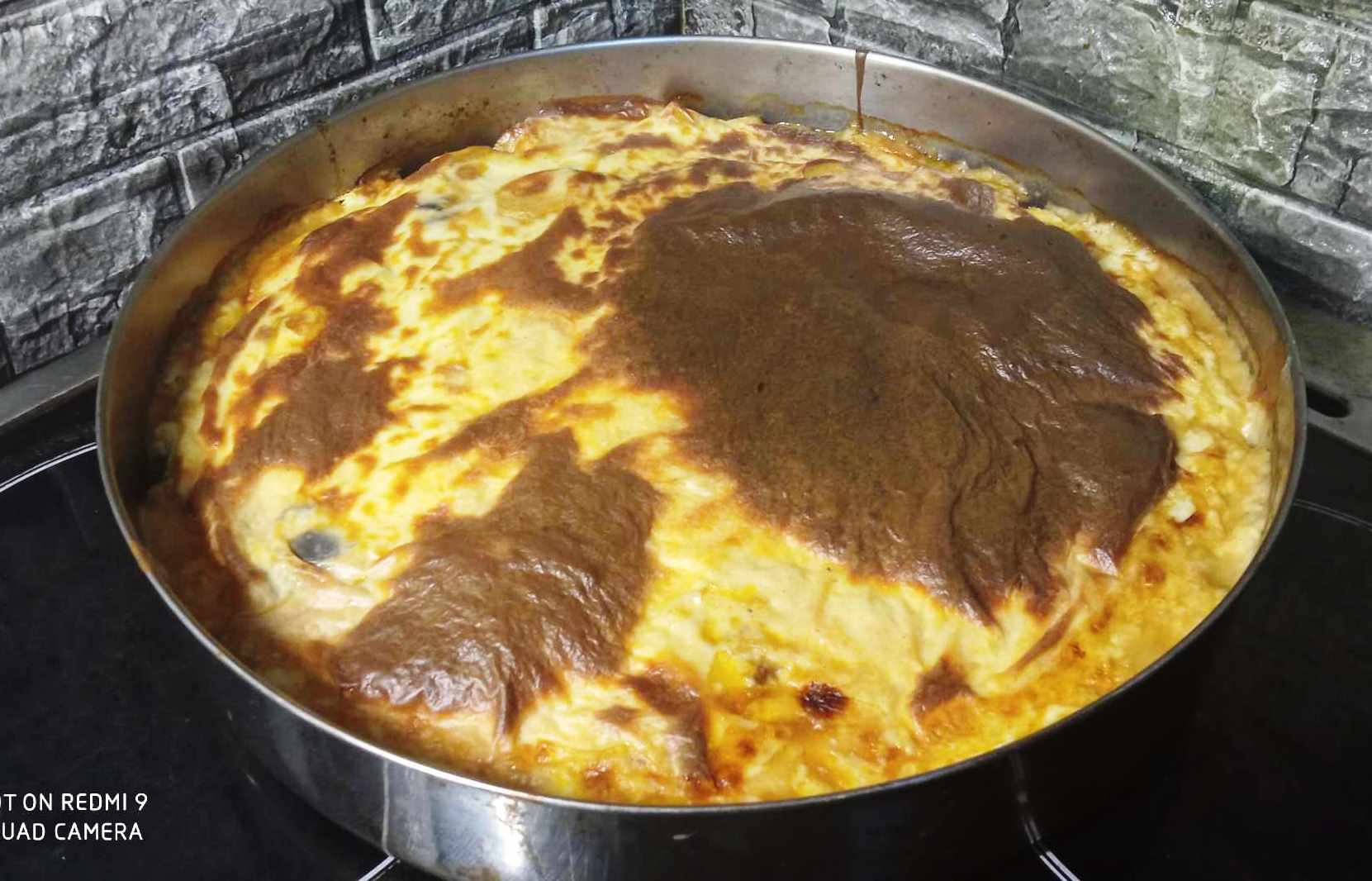 Στο ταψί με την γέμιση από πάνω περιχύνουμε ομοιόμορφα τη σάλτσα μπεσαμέλ.