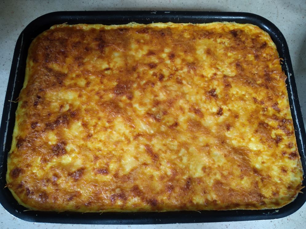 Προς το τέλος του ψησίματος, πασπαλίζουμε με το υπόλοιπο κεφαλοτύρι και το τυρί γκούντα και πασπαλίζουμε και λίγο φρυγανιά τριμμένη για να γίνει ωραία η κρούστα. Αφήνουμε να ροδίσει η επιφάνεια.