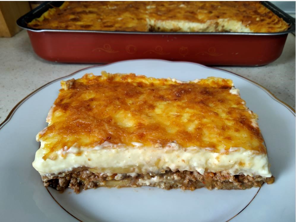 Κάνουμε μια στρώση τις μελιτζάνες. Αδειάζουμε σε μια στρώση όλο τον κιμά. Σκεπάζουμε τον κιμά με τις υπόλοιπες πατάτες και καλύπτουμε με την μπεσαμέλ.