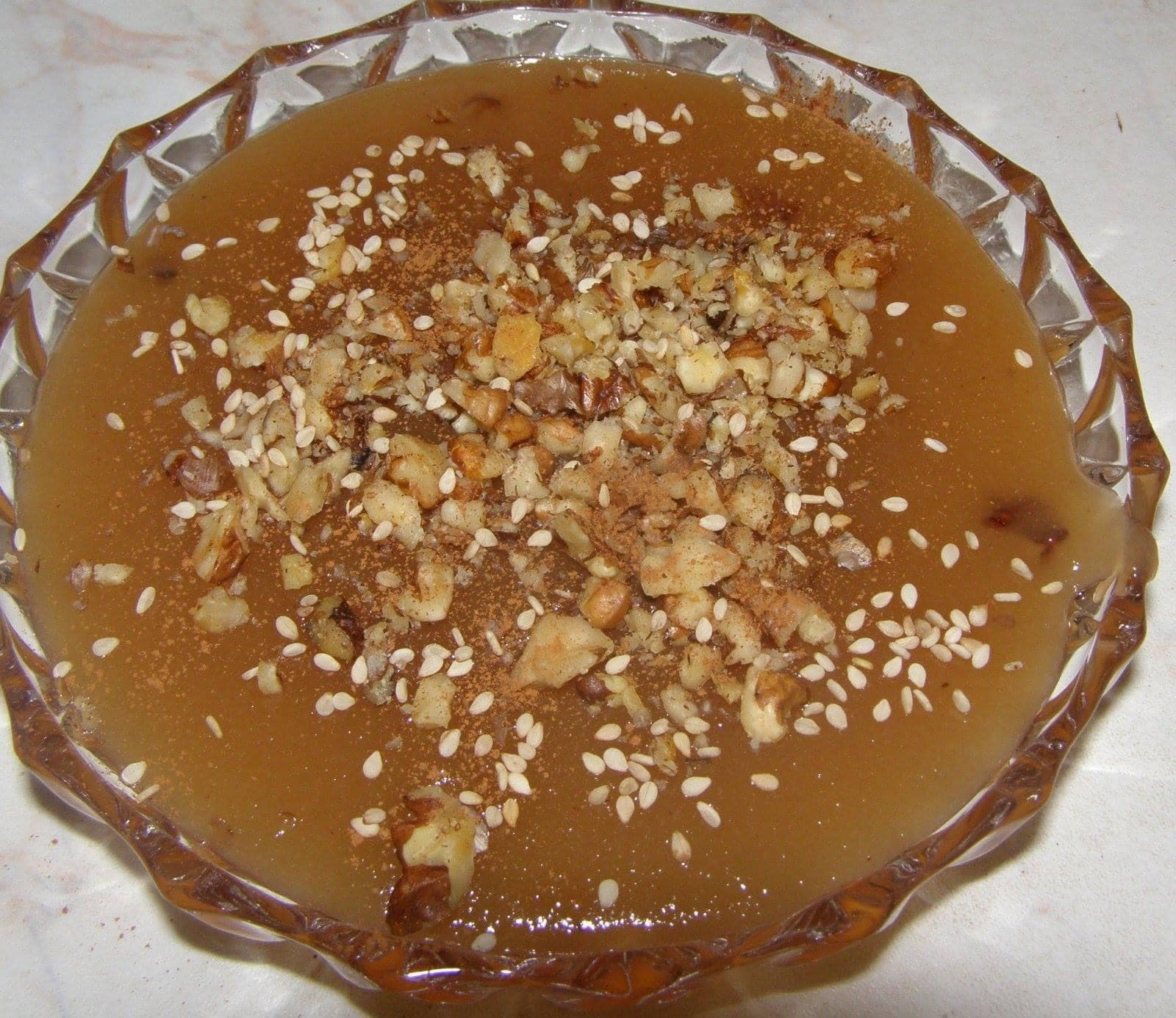 Για να το σερβίρω, πασπαλίζω με χοντροκομμένα καρύδια, σουσάμι και κανέλα. Καλοφάγωτο!