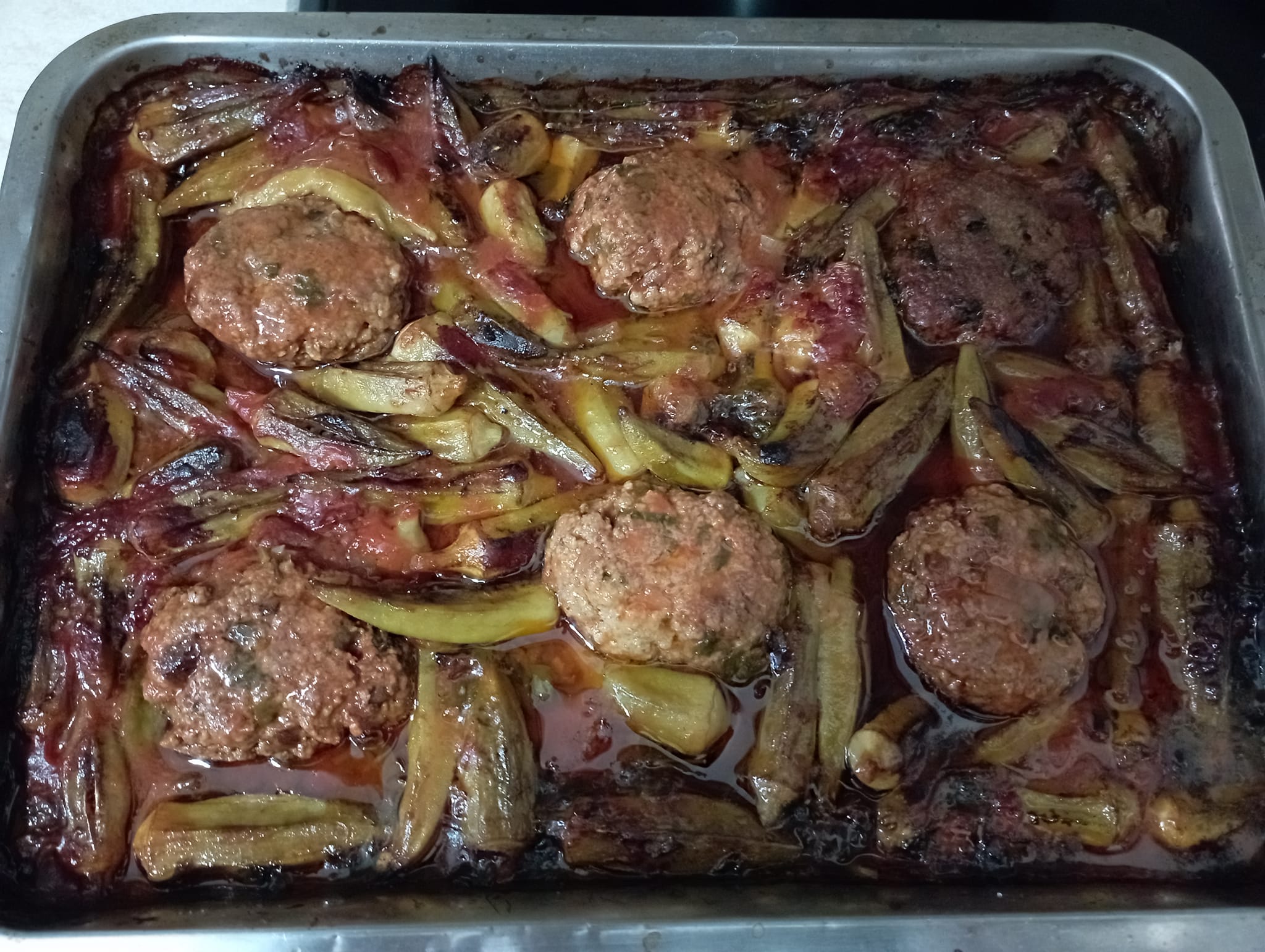 Στο ταψί έστρωσα τις μπάμιες με ελαιόλαδο, αλάτι πιπέρι, μαϊντανό και πελτέ αραιωμένο με νερό,έβαλα 6 μεγάλους κεφτέδες και έψησα στους 180 βαθμούς περίπου 40′ στο φούρνο μέχρι να μείνει το φαγητό με την σάλτσα του και το λαδακι του.